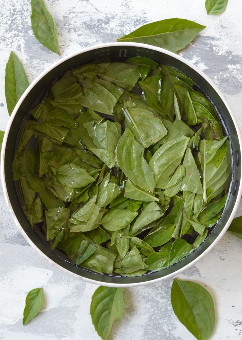 - In a small pot, add your water, basil, and monk fruit. Bring to a boil, then simmer on low for 15-20 minutes. Remove from heat and allow to cool for 20 minutes. Pour through a fine mesh strainer and store in the fridge up to 2 weeks.