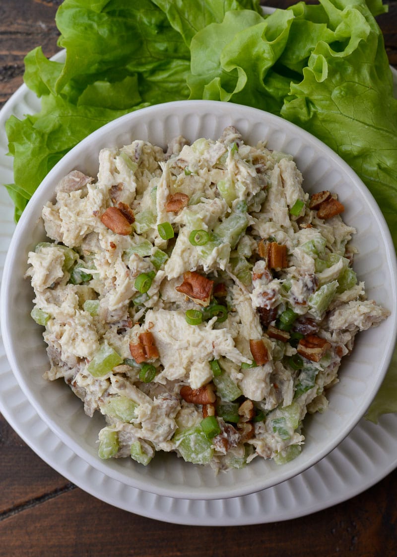 The best thing about chicken salad is how easy it is to make! Put all your ingredients in a bowl, mix until well mixed, then chill until you’re ready to serve. You can sprinkle more pecans, green onions, or fresh herbs on top as garnish, too. If you’re measuring out your ingredients beforehand, it can be helpful to refer to this guide on How Many Ounces in a Cup, especially if you’re using canned chicken. This guide is easy to follow and printable, so you can refer back to it any time you need it!