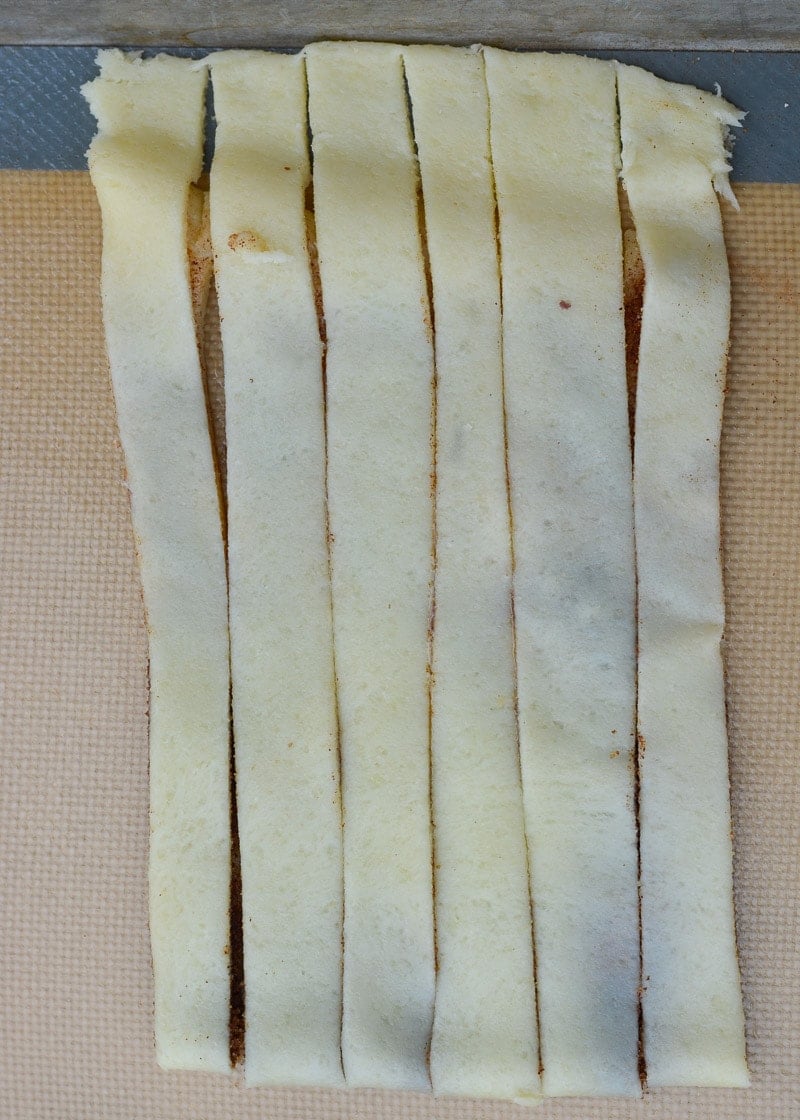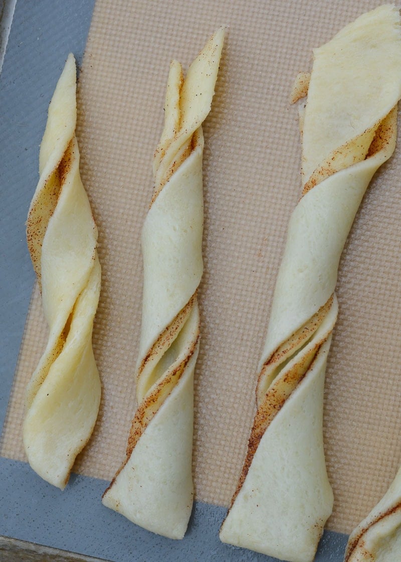 - Use a pizza cutter or sharpe knife to cut the dough into thin strips. Carefully twist the dough and place on the silicone lined baking sheet.