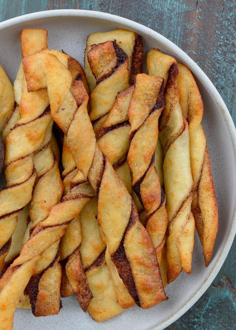 Nobody would guess that these Keto Cinnamon Twists are low carb and sugar free! They taste just like they’re made with puff pastry and filled with cinnamon sugar… But they’re actually made with a fathead dough and filled with a mix of cinnamon and monk fruit sweetener! They taste like a Keto Cinnamon Roll but have more crispy edges.