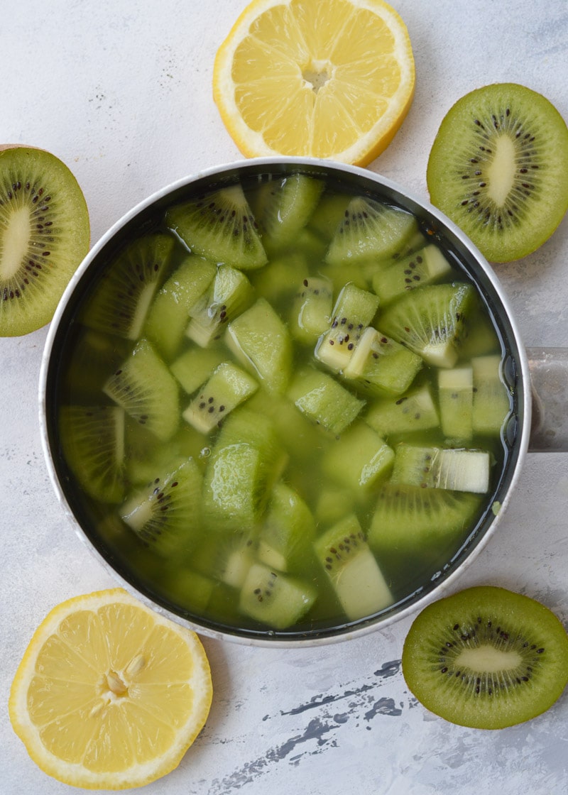 Use 2 cups of chopped, peeled kiwi with 1 cup of water and 1 tablespoon of liquid monk fruit. Boil the fruit in water for 15-20 minutes, mashing occasionally. Allow it to cool for about 20 minutes, then strain, add your monk fruit, and pour into an airtight container.