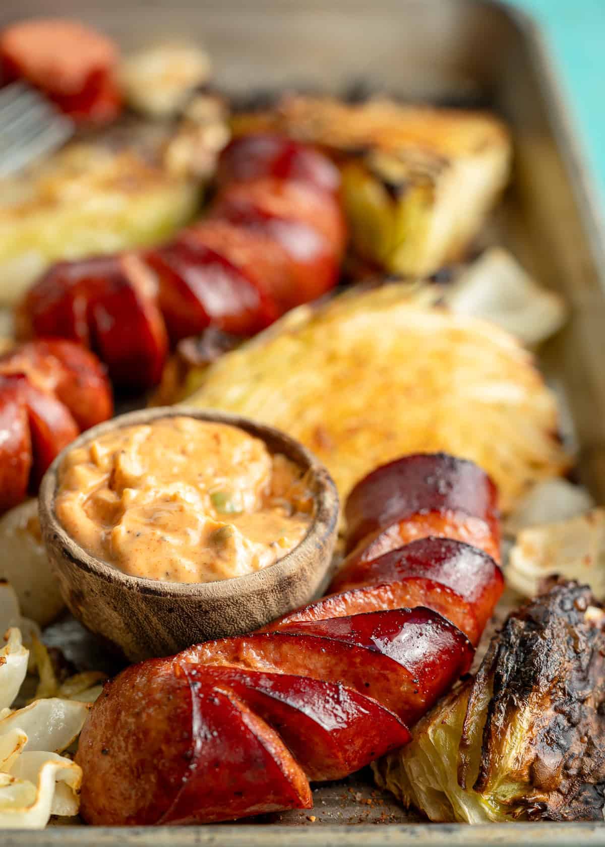 - Add the sausage and onion to the sheet pan.