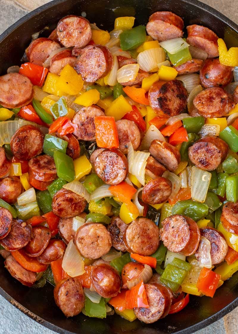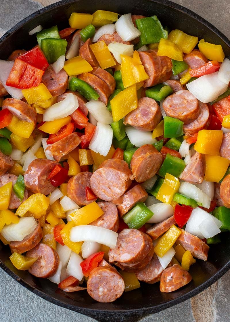 This recipe is SO simple! Heat a large skillet to medium heat, then lightly spray with cooking oil. Dump your sausage, peppers, and onion into the skillet. Stir occasionally, cooking until the sausage has browned and the vegetables are tender (about 7-8 minutes). Add salt and pepper to taste, then serve immediately!